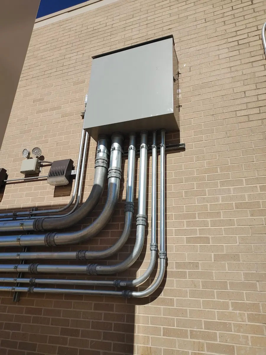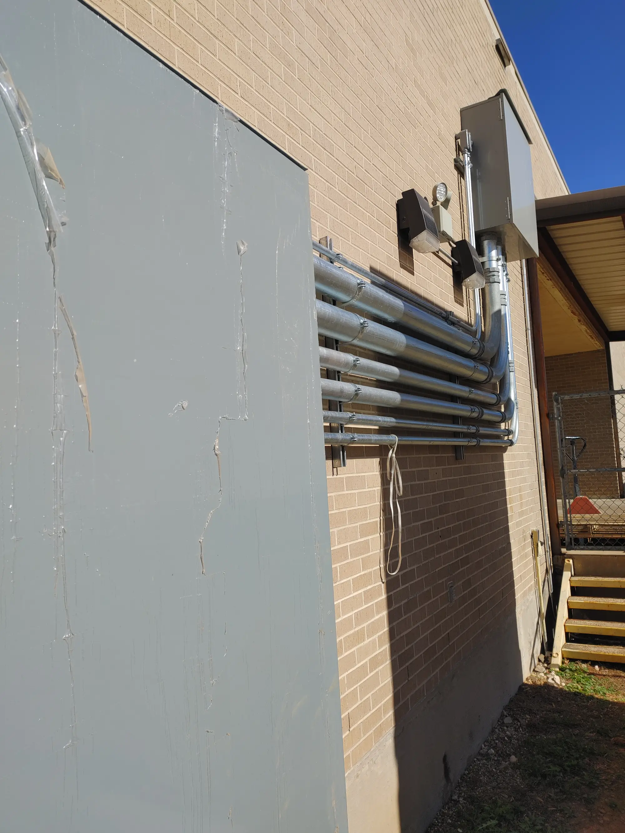 For a hospital in Winnsboro, TX, we completed a conduit run to their 800kv generator so their power supply would be safe and effective. We even painted the box to the right of the generator docking station we added to match the existing color.